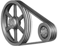 The feedwater pump belt and sheaves connect the feedwater motor to the pump. The smaller sheave is connected to the motor shaft and the larger sheave (typically 4 times larger) to the pump shaft. The sheaves are connected to each other by rubber v-belts. The motor speed is controlled by a VFD and as the motor spins it rotates the sheaves which in turn increases or decreases the pump speed. The number of belts (typically 4-6) and the required sheave size depend on the horsepower of the motor and the size of the pump. The sheaves and belts will be surrounded by a metal belt guard to prevent objects from coming in contact with the system while it is running. There will be a hinged door or a cutout over the center of the pump sheave, and possibly also the motor sheave, in order to measure the crankshaft speed. The crankshaft speed of the pump sheave is necessary for calibrating the feedwater flow rate.