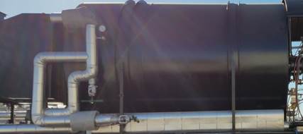 The feedwater system includes all piping and equipment used with water before entering the convection section. Water enters the system and travels through an inlet stabilizer. Positive displacement pumps (like the feedwater pump) contain an inlet valve that continuously opens and closes, creating an acceleration and deceleration of fluid into the pump. The inlet stabilizer (pulsation dampener) minimizes pressure fluctuations created from this to stabilize the flow pattern at the pump inlet which helps to extend the service life of the pump. Inside the stabilizer is either a membrane or a bladder filled with pressurized gas. As turbulent water enters the stabilizer, the gas filled membrane or bladder absorbs the excess energy and returns the water to a more laminar flow pattern