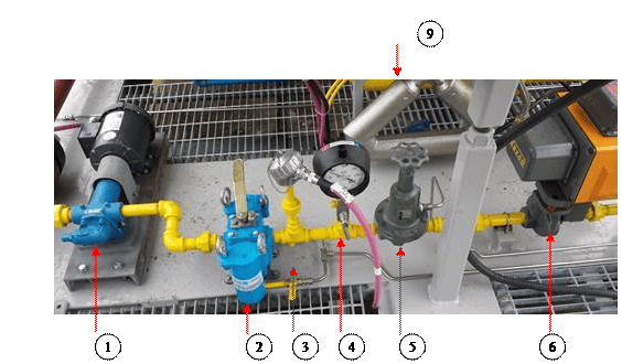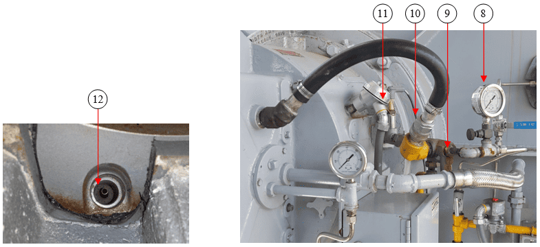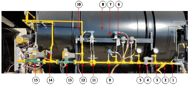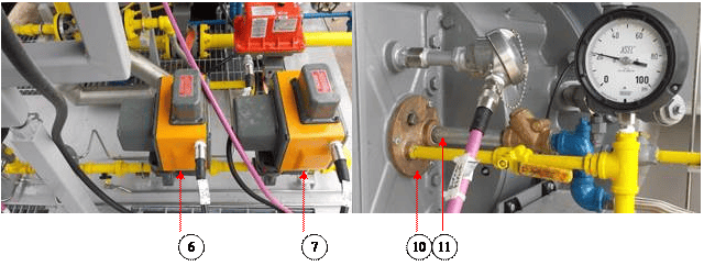 After leaving the strainer, the oil will pass through a temperature transmitter, pressure gauge or transmitter, pressure regulator, and possibly a high and/or low-pressure switch. The temperature and pressure transmitters are not mandatory components as the flow of oil is not a calculation based on these values like water and gas flow are. The regulator is used to maintain back pressure and reduce the oil pressure to the requirements for the burner. The oil then passes through the block valve, safety valve, control valve, and enters the Coriolis flow meter. Unlike the gas line, the oil train will not have a vent line and valve in-between the block and safety valves. Upon leaving the flow meter, the oil will enter the burner through a small plate that also contains the inlet for the air/steam atomization piping. Oil piping will most commonly be painted yellow, but may also be red.