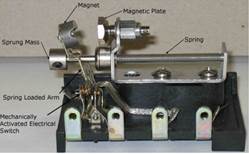 When vibration occurs, the magnet on the spring-loaded arm generates inertial forces that oppose the magnetic force holding the switch closed. Once the vibration generates an inertial force greater than the magnetic force, the switch trips and will remain tripped until reset. To reset the switch, press the pushbutton on the bottom side of the switch (opposite side of the set screw) this will manually push the magnet back into place with the magnetic plate. The vibration switch can be tested to ensure it is functioning properly by hitting the exterior of the switch with a hand or tool to make sure it trips.
