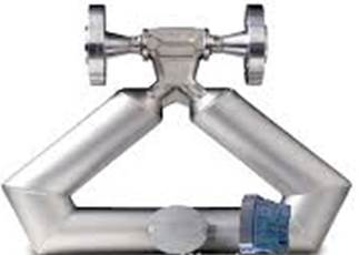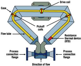Instead of having a rotating frame of reference, Coriolis meters work on the principle that the inertia created by fluid flowing through an oscillating tube causes the tube to twist in proportion to the mass flow rate. Inside the Coriolis meter are two tubes. These tubes have a magnetic coil that causes them to vibrate and bend in opposition to each other. Sensors made up of a magnet and coil assembly are mounted on the inlet and outlet of each tube. The magnets create a magnetic field and when the coils move through the field, they create a voltage in the form of a sine wave. When there is no mass flow, the motion of the two tubes is symmetrical. When there is mass flow, the two vibrations are out of sync. The two vibrations are shifted in phase with respect to each other and the degree of phase-shift is a measure of the amount of mass that is flowing through the tubes.