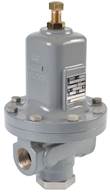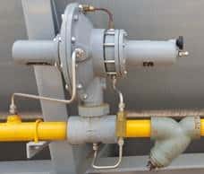 Upon leaving the strainer, the gas will enter the main regulator, which is used to reduce the gas pressure to the lower pressure needed for downstream service (typically 30-45 PSI). The size of the regulator depends on the flow rate of gas and the upstream gas pressure. A regulator is made up of three parts: restricting element, loading element, and measuring element. The restricting element is a valve that can provide a variable restriction to the flow. The loading element is a part that can apply the needed force to the restricting element and is typically a spring. The measuring element determines when the inlet flow is equal to the outlet flow and is typically a diaphragm.