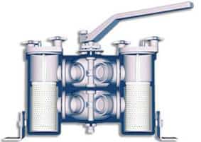As with the gas train, the fuel oil train begins with a manual shutoff valve (typically a ball valve). The oil then passes through the burner feed pump which pressurizes the oil and sends it through a duplex basket strainer. Each side of the strainer has a mesh basket that catches any debris and allows the oil to flow through. The handle on the top of the strainer diverts the flow of oil to a single side, which allows the strainer to be cleaned without shutting off the oil. The bottom of each side will have a small valve that can be used to drain out any remaining oil from a side when it needs to be cleaned. The strainer can be cleaned by diverting the flow to the opposite side, opening the drain valve, removing the top on the side to be cleaned, and taking out the basket.