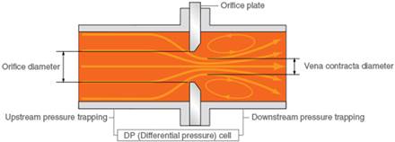 Orifice plates are thin metal plates with a machined circular and concentric bore, a sharp edge on the upstream side, and a beveled edge on the downstream side. The circular portion is wedged between two orifice flanges, each of which contain a flange tap for the DPT and is used for measuring the flow rate of a fluid passing through it based on Bernoulli’s equation. Bernoulli’s equation states that the pressure drop across a constriction is proportional to the square of the flow rate. To preserve the pipe size, an orifice plate is used to constrict the flow and provide a pressure differential. As a fluid flows through the orifice constriction, it is forced to converge which increases its velocity and decreases the downstream pressure. The location of maximum velocity and minimum pressure is known as the vena contracta. After that point the fluid expands, the velocity falls, and the pressure increases.