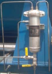 The quality sample condenser is used to cool a portion of the water exiting the steam separator in order to take a TDS meter reading. This reading is used in conjunction with a TDS reading of a sample of feedwater to estimate the current quality that is being produced and make any calibration adjustments if necessary. The sample condenser will typically consist of a vessel which will fill with cool feedwater. This vessel will have a coiled tube inside which will have the hot water from the steam separator running through it.