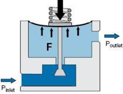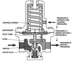 Regulators come in both single and double stages. For a single stage regulator, gas enters the regulator and flows through the opening above the valve plug. As the pressure in the body of the regulator increases, the upward force exerted on diaphragm increases which compresses the top spring and raises the valve plug. This limits the flow allowed into the body thus reducing the pressure. Turning the set screw clockwise would increase the control spring tension and increase the maximum pressure allowed in the body. Turning the set screw counterclockwise would have the opposite effect and lower the allowed pressure.