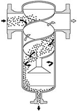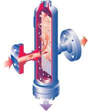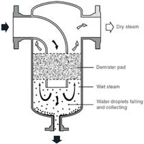 The three most common types of separators used are baffle, cyclonic, and coalescence separators. A baffle separator consists of several baffle plates which cause the steam to change direction as it passes through the separator body. The entrained water has a greater mass and inertia than the steam, thus, when there is a change in flow direction, the dry steam flows around the baffles and the water droplets collect on them. A cyclonic separator uses a series of fins to create a high-speed cyclonic flow. The velocity of the steam causes it to swirl around the body of the separator. This causes the heavier water droplets to fall out of suspension and hit the walls where they collect and flow to the drain. A coalescence separator forces the steam flow through a mesh pad, also called a demister pad. The demister catches the water droplets as steam flows through it. The droplets increase in size until they are too heavy and fall to the bottom of the separator.