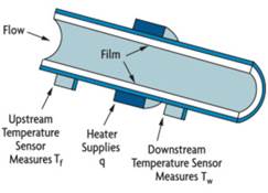 Thermal mass meters typically come in two styles: immersion and externally heated. Immersion heaters place the heat source and temperature sensors within the pipe and use the first measurement method described above. Externally heated thermal mass meters have the heat source and temperature sensors mounted to the outside of the pipe. This style is more commonly used for corrosive fluids and gases or fluids which would create a coating effect and inhibit correct measurement. However, mounting the sensors externally slows the response rate of the sensors and makes the measuring process nonlinear. This is because the heat introduced is distributed over a portion of the pipe’s surface and transferred to the process fluid at different rates along the length of the pipe.