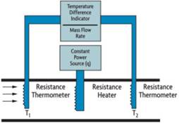 Thermal mass meters measure the flow rate of gases and liquids based off of the convective heat transfer properties of the fluid. These meters can be used as an alternative to using a PT, DPT, and TT to calculate the fuel gas flow rate. Each thermal mass meter contains a heat source with an RTD or other temperature sensor on both sides and measure the flow in one of two ways. The first is by introducing a constant amount of heat into the flowing stream and measuring the associated temperature change. The second is by maintaining a constant temperature difference between the sensors and measuring the heater energy that is required to do so.