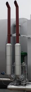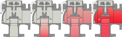 To open fully from this small overpressure, the disc typically has a shroud around it. As fluid begins to flow into the control chamber, the shroud creates a larger area for the fluid to push against. The shroud also redirects the fluid downward. The combined effects of these two factors overcompensate for the spring force as it contracts and allows the valve to open fully from a small over pressurization. Once the pressure in the system is reduced, there is not enough force to overcome the spring force and the valve closes itself. Safety relief valves will be located on the feedwater pump, the steam atomization knockout drum, and two will be on the steam line between the outlet of the radiant section and the generator pressure control valve. The two safety valves on the steam line are commonly on, or right before, the steam separator.