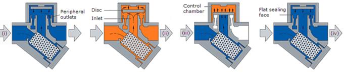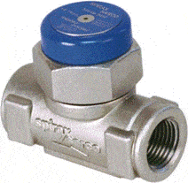 A mechanical steam trap has a float inside that raises and lowers to open the valve. As condensate accumulates inside the trap, the float will float on top of the water and rise with the level of the water present. Eventually the float will reach a point where it will open the valve and all the condensate will be drained. The body of the trap will then fill with steam and the float will drop down and close the valve since it cannot float on steam. The last and most common for steam generators is the thermodynamic trap, also sometimes referred to as a disc trap. Inside the thermodynamic trap is a disc that covers a hole in the outlet of the valve. Before steam is made, water and air force the disc up away from the hole and flow through the valve outlet. As steam is produced, it fills the cavity above the disc and pushes it down until the outlet hole is covered. Over time the inlet cavity will fill with condensate while the steam continues to apply a downward force on the disc. The steam in the chamber above the disc will eventually begin to cool and condense, at which point the upward force from the condensate will exceed the downward force on the disc and the disc will lift and drain the valve.