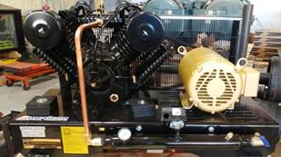 The air compressor is made up of two parts; the motor and the cylinder. The motor electrically drives the attached sheave (slotted wheel that the drive belts sit in) which rotates the larger cylinder sheave. This drives the pistons inside the cylinder in and out creating a vacuum. As each piston retracts, the voided space gets filled with air from around the compressor, which is brought in through the inlet valve. When the piston extends, that same air is compressed and given enough strength to push through the discharge valve while simultaneously holding the inlet valve shut. From there the air enters a storage tank which increases in pressure as the tank fills. Each compressor will have a setpoint pressure. Once the tank pressure reaches the setpoint, the compressor turns off. As air is used by instruments, the pressure will decrease and the compressor will turn on to maintain the tank setpoint pressure. Downstream of the air compressor will be the instrument air pressure switch. This switch will be on the piping before air is split off into the inlet lines for pneumatic devices and ensures there is adequate pressure for these devices to function properly.