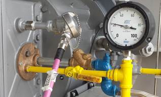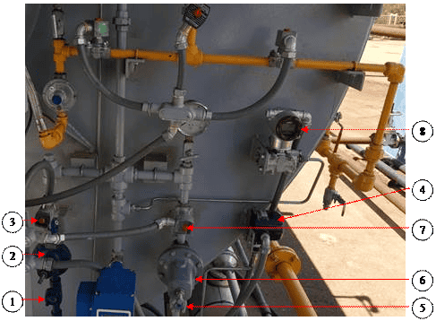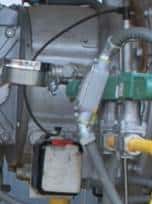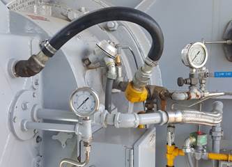 A pressure transmitter will be present on the piping between the air and steam lines. A high- and low-pressure switch can also optionally be installed. For steam generators set up to run at high pressures, there may be an additional high stage pressure control valve to reduce the pressure before the steam enters the knockout drum. In this case, an additional pressure transmitter will also be present to measure the pressure after the control valve. Both the steam and air piping will connect to one pipe which will go to the burner. This piping attaches to a plate on the side of the burner that also has an inlet for the fuel being atomized.