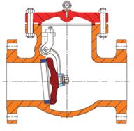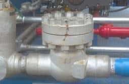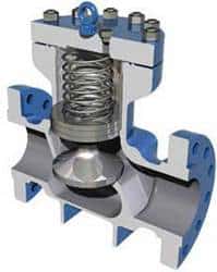 Check valves are self-contained valves that allow a fluid to pass through in only one direction and are used throughout the water, steam, and air piping on a steam generator. This type of valve relies solely on the flow of the fluid for it to open and close. As flow increases, the pressure against the disc also increases. This pressure will rise until it reaches the cracking pressure at which point the disc will move and allow the fluid to pass through. If the flow rate becomes too low or reverses, the disc will seal the valve.
