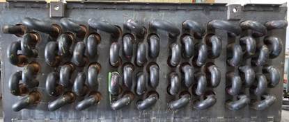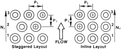 The ends of the tubes are all interconnected into one long coil using return bends, which are located on two sides of the convection box and are covered with removable doors. The doors are only removed in order to replace broken tubes or return bends. The rows of tubes can either be arranged in a staggered or inline layout. Staggered layouts shift over every other row so the tubes are between the rows below them, while inline layouts have all the rows aligned in straight rows vertically. Staggered layouts are more practical for steam generators because they required less space, and facilitate better contact time and turbulence for the exhaust gas passing through
