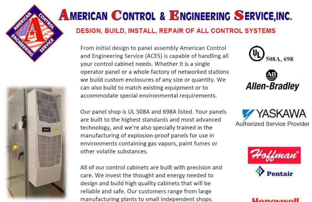 From initial design to panel assembly American Control and Engineering Service (ACES) is capable of handling all your control cabinet needs in our UL508A and 698A certified panel shop. Whether it is a single operator panel or an entire factory of networked stations. your custom enclosure will be built to the highest standards and with the most advanced technology.